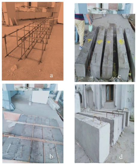 (a) Main reinforcement with Stirups; (b) Mould filled with concrete. (c,d) Drying of beams.