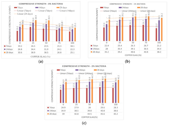 Compressive strength of copper slag concrete with micro-organisms. (a) 0% bacteria. (b) 1% bacteria. (c) 2% bacteria.