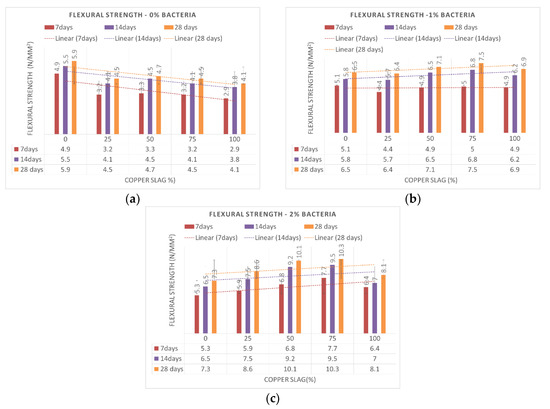 Flexural strength of copper slag concrete with micro-organisms. (a) 0% bacteria. (b) 1% bacteria. (c) 2% bacteria.