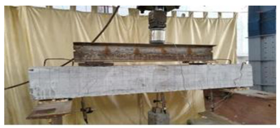 The IS 516 (1959) [34] standard was utilised to evaluate the concrete’s flexural strength. The experiment used a 500 mm × 100 mm × 100 mm beam mould [35]. A waste towel was used to dust and lubricate the faces of the beam mould. All of the concrete mixtures that were remediated by bacteria were poured into the mould. After 24 h, the specimens were extracted from the mould and cured in water. The flexural strength of the specimens was evaluated on days 7, 14, and 28. Prior to evaluation with the universal testing machine, the specimens’ surfaces were dried. Using a two-point loading method, the specimens were permitted to fail at a progressive rate. Figure 2 illustrates the experimental setup and failure pattern. The IS 516 (1959) specified equation was used to calculate the flexural strength of the concrete.