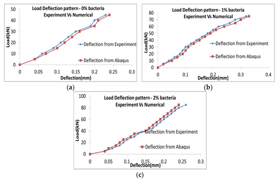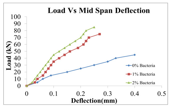 In RCC beams measuring 230 mm × 280 mm and 1500 mm, the optimal mixture of copper slag and varying bacteria application percentages was evaluated. The beam’s deflections were measured at both the compression and tension sides of the midspan. With a 75% substitution of copper slag and 1% bacteria, the crack began at 75 kN, the ultimate load reached 80 kN, and the deflection value was 0.33 mm. With a 75% copper slag replacement and 2% bacteria, the crack began at 75 kN, the ultimate load was 85 kN, and the midspan deflection of the ultimate load was 0.26 mm. For the controlled concrete, the cracks started at 40 kN and the ultimate load was 45 kN. As a result of the micro-organisms’ activities, the load–deflection behaviour of copper slag concrete improved. The maximum midspan deflection of a beam with zero percent bacteria was approximately 0.4 mm, and as the proportion of bacteria increased, the deflection decreased. The load–deflection pattern is illustrated in Figure 17.