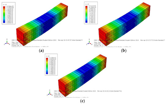 Deflection patterns from ABAQUS. (a) 0% bacteria (conventional concrete). (b) 75% demolition waste with 1% bacteria. (c) 75% copper slag with 2% bacteria.