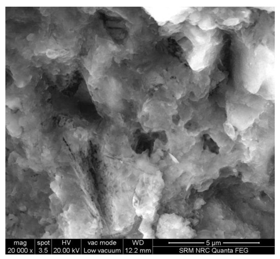 SEM image for copper slag concrete with 75% substitution of copper slag for coarse aggregate and 2% Bacillus subtilis.