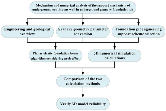 Taking an underground grain silo project as the engineering background and using its geological situation as the analysis basis, the support scheme selects the continuous underground wall and the inner support enclosure method and studies the design and calculation method of underground grain silo foundation pit engineering using underground continuous wall technology as the support method. This article also studies the dynamic construction process by numerical simulation of the underground grain silo foundation pit support through Abaqus so as to calculate the deformation and force of the foundation pit and support and monitor deep changes in horizontal displacement of the continuous underground wall in real time during the construction process. Compared with the calculation results of the plane foundation beam method, the monitoring data and numerical simulation results are compared and analyzed, and the accuracy of the results and the rationality of the model are verified, which provides a reference for a method of supporting deep foundation pits similar to continuous underground walls, which has a certain positive effect on promoting the construction and development of an underground granary, and promotes the development of “two walls in one” technology of a continuous underground wall support in engineering. The technology research roadmap is shown in Figure 1.
