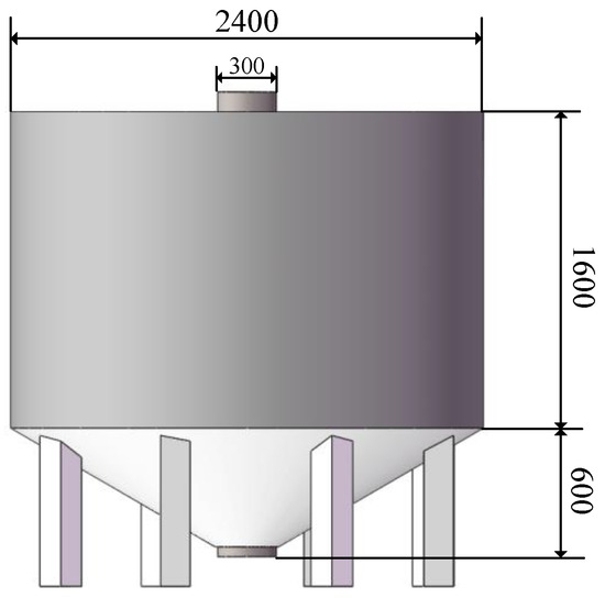 In Figure 2a,b, the stratum distribution of this project’s foundation pit site for an underground granary building project is depicted. According to the building’s design, which is seen in Figure 3, the underground grain storage facility has a storage capacity of 5000 t, a diameter of 24.00 m, and a depth of 22.00 m (including the inverted conical bottom structure with a depth of 6 m). The self-waterproof concrete used to construct the warehouse body has an impermeability grade of P12.