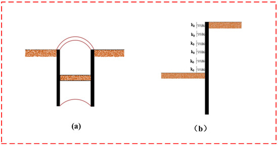 This research optimizes the plane elastic foundation beam method, taking into account the arch effect by internal force analysis of the diaphragm wall [23]. Its calculating method is to discretely transform the space arch effect of a circular foundation pit into a spring support and then calculate using the spring support, as shown in Figure 4.