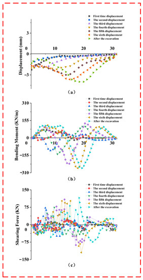 When the equivalent bracing parameters are entered into the deep foundation pit software, 18 virtual bracing cases must be added to the original working conditions. The arch effect of the diaphragm wall begins to occur in the foundation pit project after the pouring and before the excavation of the foundation pit. As a result, when the project is calculated using Lizheng deep foundation pit software, the structural calculation of the diaphragm wall is performed after the virtual support working condition is added. After the continuous underground wall is poured into the excavation of the foundation pit, the continuous underground wall has little effect on the water and soil pressure; in the theoretical situation where the inside and outside of the wall are balanced, at this time, the displacement and internal force are zero. After the excavation of the foundation pit, the displacement, bending moment, and shear force of the supporting structural change in Figure 5a–c are the result of the elastic foundation beam algorithm; observing the displacement and internal force change diagram of the supporting structure excavated by the foundation pit, it can be seen from the change in the figure that in the initial stage of the excavation of the foundation pit, the supporting structure is deformed into a cantilever type. With the excavation of the foundation pit and the addition of support, the deformation of a continuous underground wall gradually takes the form of a parabolic combination, meaning that the horizontal displacement in the middle of a continuous underground wall is the largest and the horizontal displacement at the bottom is the smallest. This means that the horizontal displacement at the top of the foundation pit support structure is the largest. It can be seen from the figure that after the excavation of the foundation pit, the maximum displacement is in the middle of a continuous underground wall, the value is 4.7 mm, the maximum bending moment is −279.25 kN*m, and the maximum value is also located in the middle of a continuous underground wall.