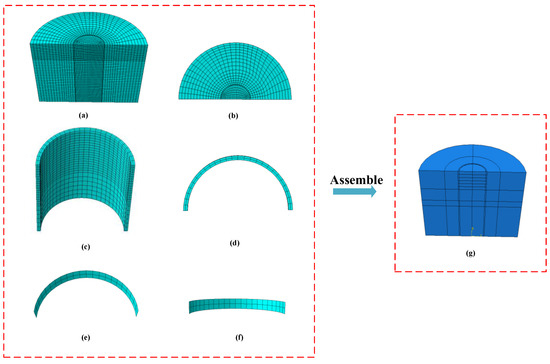 According to Figure 8, the curved surface of the foundation pit soil restricts the displacement in the x and y directions, the symmetrical section of the foundation pit soil restricts the displacement in the x and y directions, the top of the soil model does not impose constraints, and the bottom of the soil model restricts the displacement in the x, y, and z directions.