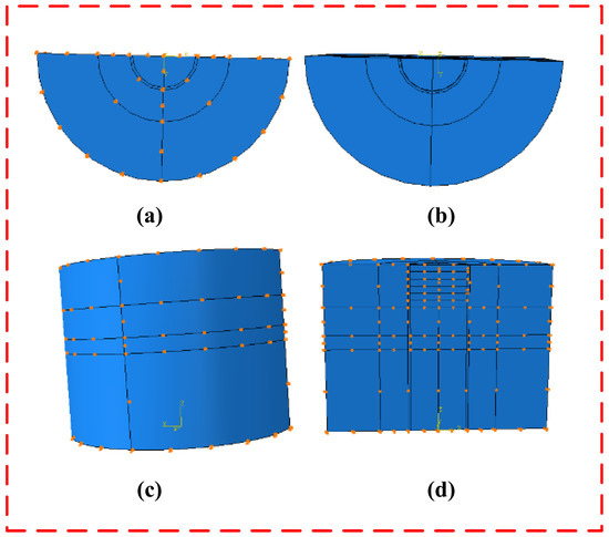 Schematic diagram of model constraints: (a) model bottom constraints; (b) model top constraints; (c) model side constraints; (d) model frontal constraints.