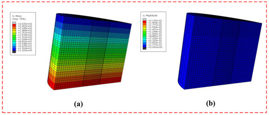 The stress–displacement nephogram after in situ stress equilibrium: (a) stress contour; (b) displacement contour.