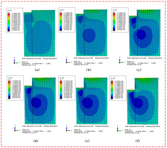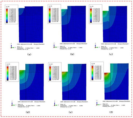 Vertical displacement cloud image of soil: (a) underground first floor; (b) underground second floor; (c) underground third floor; (d) underground fourth floor; (e) underground fifth floor; (f) underground sixth floor.