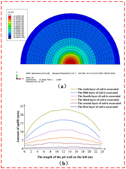 The bottom of the pit: (a) soil profile displacement cloud; (b) pit floor vertical displacement diagram.