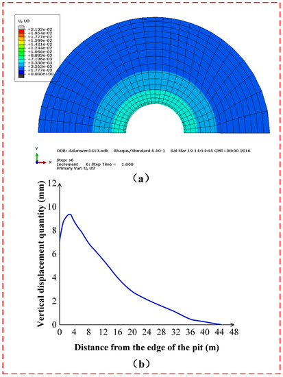 The ground surrounding the foundation pit will subside when the surrounding soil moves throughout the excavation process. The cloud map of the ground’s vertical displacement is shown in Figure 13. Figure 13a demonstrates the vertical downward deformation of the earth surrounding the foundation pit, which increases and subsequently diminishes as one moves away from the pit. The surface settling is depicted to be moving away from the foundation pit in Figure 13b. The greatest surface settlement, which is located at the surface 5 m from the side of the foundation pit and is 11.34 mm, can be observed in Figure 13b. Thereafter, the surface settlement steadily declines in the direction away from the foundation pit until it reaches zero.