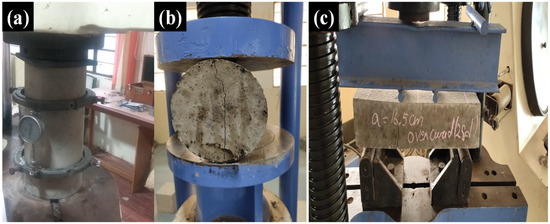 After the cooling treatment, experiments were conducted to obtain the concrete’s stress–strain behavior, FS, CS, and TS. An average of three samples was considered in the present investigation to achieve accuracy. A detailed experimental procedure is elaborated below. The test images are illustrated in Figure 2a–c.