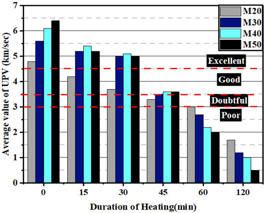 - As the duration of heating increased, the UPV values of heated concrete specimens decreased for all the grades of concrete. The UPV result shows the poor quality of concrete after 60 min of exposure and zero values at 180 and 240 min of exposure. At 45 min, the UPV values of M-20 and M30 specimens showed poor quality, whereas M-40 and M50 specimens exhibited good quality.