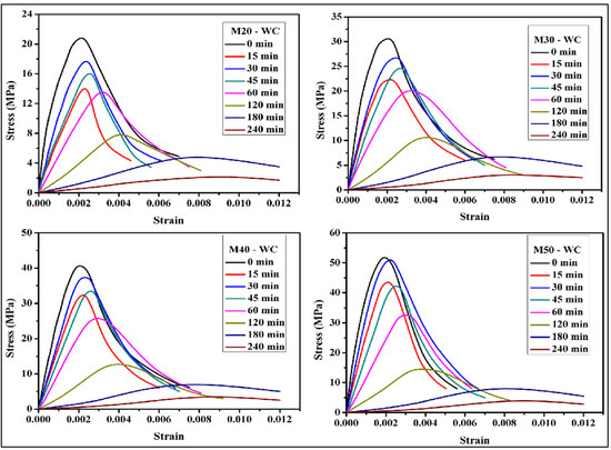 In lower-grade concrete with a higher water content, the water evaporates and develops more pores when heated. This naturally weakens its internal microstructure. Between 15 and 30 min of heating, all the specimens showed a slight increase in strength. M-50 concrete specimens were observed to have the maximum strength gain. M-40 and M-50 grades slightly enhanced their strength by 1.5% and 5.4% of the original strength. Therefore, within 30 min of exposure, M-50 grade was observed to exhibit a strong performance. This can be attributed to the fact that the water-to-cement ratio of M-50 is low as it is less hydrated. Consequently, a greater quantity of unreacted cement particles is available for rehydration under 30 min. Over 30 min, a greater reduction in stress occurred in M-50 concrete specimens, compared to other specimens [30]. This decrease in strength was due to the dehydration and decomposition of the internal chemical structure in the cement paste as the exposure duration and temperature increased [31,32].