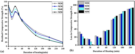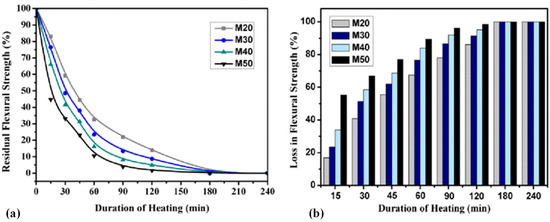 The FS of specimens is directly proportional to the CS of concrete. A similar observation was made in the case of the residual FS of concrete. However, the reduction rate of FS was stronger than the residual CS of concrete. Figure 8a,b show the residual and loss of FS of concrete exposed to standard fire. Trials have been conducted to identify the residual FS of concrete specimens exposed to different temperatures for various heating and water cooling durations. At the beginning (up to 15 min), the reduction in FS was minimum. Later, the reduction in FS increased along with the increase in the heating duration. The retained FS of concrete with various strength grades cooled by water after exposure for 15 min was observed to be between 82% and 55% of the original strength (M-20 to M-50). Although all grades of concrete specimens gained CS at 30 min of fire exposure, a greater loss was observed for FS at this exposure duration. Losses in FS are attributed to cracks that degrade the cross-sectional area, and tensile stress causes cracks to widen [42].