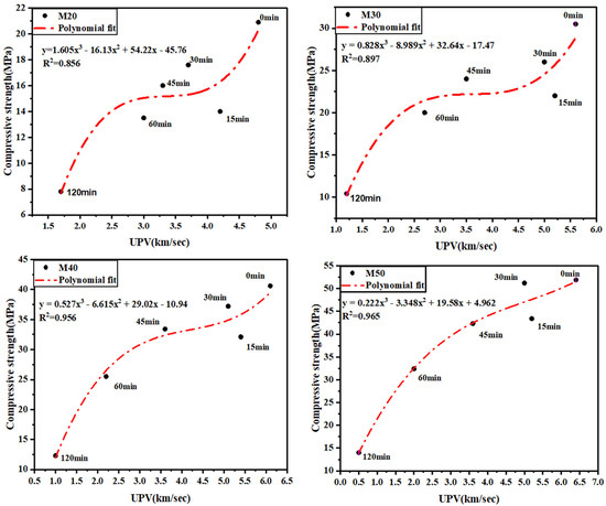 Figure 6 represents the polynomial relationship between the compressive strength and UPV of concrete based on the fitting curve subjected to elevated temperatures. As the compressive strength of concrete increased, the UPV of concrete also increased. As the duration of heating and temperature increased, the compressive strength and UPV values drastically decreased. The proposed equations were observed to be excellent with high regression values.