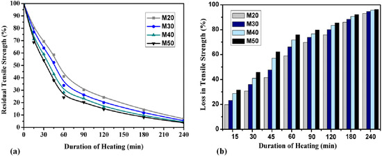 The higher TS was attributed to the crack formation in the concrete. The higher TS enables a resistance of crack propagation developing in the concrete due to internal water pressure when exposed to elevated temperatures [34]. Figure 7 a, b depicts the residual and loss of TS of concrete exposed to different temperature regimes. An increase in temperature exposure significantly decreased the residual TS for all the strength grades. The residual TS values of different strength grades exposed to 15 min (718 °C) durations of heating and cooling by spraying water were 80.2%, 76.9%, 71.2%, and 68.5% of the initial strength for M-20- to M-50-grade concrete, respectively. The residual TS values of different strength grades exposed to 30 min (821 °C) durations of heating and cooling by spraying water were 69.3%, 64%, 59%, and 54.1% of the initial strength for M-20 to M-50 samples. At 45 min (873 °C) duration of heating and cooling by spraying water, M-20 to M-50 samples had residual strength values of 58.4%, 52.3%, 43%, and 24.1% of the initial strength, respectively. The retained strength values of various strength grades beyond 60 min (925 °C) durations of heating and cooling by spraying water were 41.1%, 33.8%, 28.2%, and 24.1% of the initial strength for M-20 to M-50 samples. At 90 min of (977 °C) fire-exposure time, the retained/residual strength values of various strength grades of concrete specimens cooled by spraying water were 30.2%, 26.1%, 23.4%, and 20.3% of the initial strength for M-20 to M-50 samples, respectively. Furthermore, the strength slowly decreased after 90 min of heating (977 °C), and the residual tensile strengths reduced to 6.9%, 5.3%, 4.3%, and 3.7% of the initial strength for M-20 to M-50 samples, respectively, at 240 min of exposure. Lower grades of concrete showed higher resistance to heat and thus a smaller reduction in TS compared to higher grades of concrete that exhibited an additional loss of strength. This may be due to thermal shock (stresses) and steep thermal gradients developing in the concrete during heat exposure. It has been speculated [35,36,37,38,39] that the decreased porosity of concrete with higher grades blocks the release of vapor. Therefore, the vapor-pressure stress in the interior region of the concrete surpasses the TS of concrete, which ends up producing a more micro- and macrocracks [30,40,41]. The observed standard deviations for M20 and M50 concrete samples were 0.11 and 0.07, respectively.