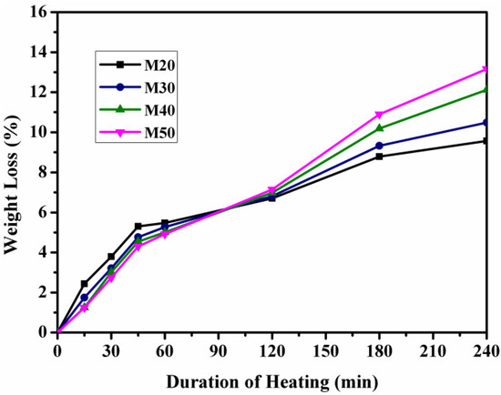 Two distinct gradient patterns exist in the scattered data of Figure 9. The initial gradient was noted from 0 to 60 min of heating, which was continued by the flatter gradient over 60 min of exposure. Due to the evaporation of chemically bound water, there was an initial weight loss (WL). Because of the degradation of Ca(OH)2, CSH, and CH hydrate, WL gradually increased after 60 min (925 °C) of heating. The water evaporation process began at the initial time duration. Hence, the WL of the specimen that was heated up to 15 min (718 °C) was negligible. After increasing the heating duration to 240 min (1133 °C), the WL values of M-20 and M-50 concrete specimens were 9.56% and 13.16%, respectively. The WL values of M-20 and M-50 concrete specimens were 2.44% and 1.24%, respectively. The influence of concrete-strength grade on WL was difficult to predict. There were two ranges of WL based on the concrete grade. The permeability and w/c ratio of the concrete were the prime factors that directly relied on the WL. The WL of M20 -grade concrete seemed to be the maximum value, i.e., about 5.47% up to 60 min. This might be attributed to the presence of the high water content in the mix; these water molecules tend to evaporate when exposed to elevated temperature causing a higher number of voids. Moreover, for M-50 concrete, it was 4.55%. When the heating duration was increased beyond 60 min, it was observed that the WL was greater for the M-50 mix; this might be attributed to the presence of a lower w/c ratio, which is less porous and has a higher amount of cement paste. The higher amount of cement produced a greater decomposition of Ca(OH)2, CSH, and CH hydrates.