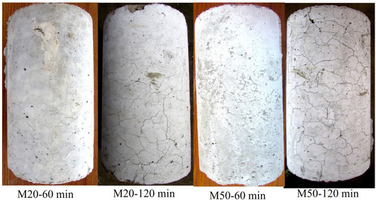 Surface spalling is the expectable critical observation in concrete subjected to elevated temperatures. The term spalling represents the stage when the separation of concrete occurs after exposure to higher temperatures due to fire loads. Spalling occurs in two stages: the creation of thermal pressure in the concrete pore structure and the shrinkage of the concrete. From the detailed assessment of the experimental results, it was observed that the surface spalling of concrete was also included based on the w/c ratio and intensity of temperature exposure, respectively. The before (0 min) and after exposure (60, 120, and 240 min) surface changes of M-20 and M-50 concrete samples were examined, and are presented in Figure 10. From the surface changes in concrete, following exposure for 60 min, both M-20 and M-50 samples showed small cracks. After 120 min of exposure, the cracks increased and voids were formed. The M-20 and M-50 specimens developed extensive surface cracks, surface spalling, and large voids. Due to the high temperature and sudden forced cooling, large cracks were created on the hot surfaces, and this led to strength reduction by the decomposition of the CHS gel layer.