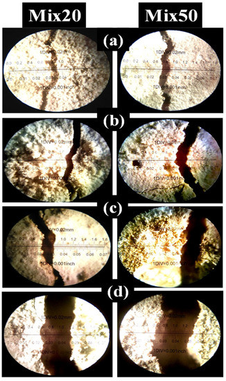 Detailed information on the crack-width measurement of concrete has also been discussed in the study, and it must be noted that it has not been presented in past studies. Elcometer equipment was used in the study to determine the crack width in the concrete. The range of the elcometer varies between 0.0 to 1.8 mm, with the lowest count of 0.02 mm. After exposure to the ISO standard curve and forced water cooling, the average crack-width values of the cube, cylinder, and beam specimens were noted. The measured crack-width images of M-20 to M-50 are illustrated in Figure 11. From the visual observations of the concrete, it can be observed that the grade of concrete and duration of heating widened the thermal cracks, and the number of surface cracks on the concrete also gradually increased.