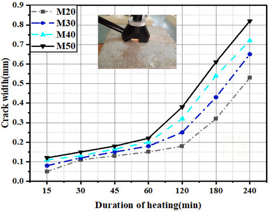 Figure 12 shows the measured crack-width values of concrete specimens after sudden cooling. From the results of the crack-width analysis, it was ascertained that with an increase in the duration of heating, the crack-width values of all the grades of concrete were observed to significantly increase. The thermal crack width of M-20 grade was 0.05–0.53 mm. For M-30 and M-40 samples, the noted range was between 0.08–0.65 and 0.11–0.72 mm. M-50 concrete’s thermal crack width varied between 0.12–0.82 mm. Between 15 and 60 min of exposure, the thermal crack-width values were less. Therefore, higher crack-width values were observed when heat exposure occurred between 60 and 240 min. The effect of elevated temperature caused severe damage to higher-grade concrete.