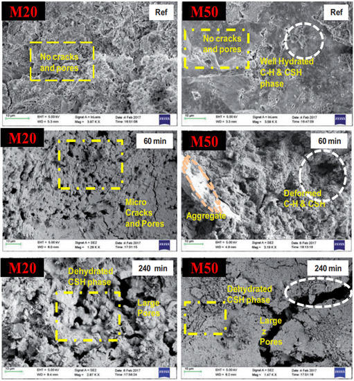 Scanning Electron Microscope (SEM) analysis was performed for reference and heated (240 min) concrete M-20 and M-50 specimens. The analysis was conducted to observe the microcracks, voids, and dispersion of CSH gel before and after temperature exposure. The SEM concrete samples were collected from the damaged specimens with a dimension of 0.24 × 0.24 × 0.1 mm. The SEM images depicted the cracks and porosity after exposure to higher temperatures. Figure 13 shows the microstructure images of reference and heated M-20- and M-50-grade concrete specimens. The analysis showed that the reference M-20 and M-50 concrete specimens with a well-packed, dense structure and well-hydrated C-H and CSH gel presented no pores and voids. In the M-50 specimen with more CSH gel and dense structure, more pores and voids were observed than in the M-20 specimens. At 60 min of exposure, the M20 concrete with well-packed hydrated CSH gel showed minor cracks. The M-50 specimen exhibited minor cracks and bond loss between aggregate and CSH gel. At prolonged temperatures (240 min), the M-20 heat-exposed specimen exhibited cracks with the dehydrated CSH phase. However, in the case of the M-50 specimen, large cracks with greater voids were observed. This was due to the high temperatures that deteriorated the bond between Ca(OH)2 and the CSH gel, which led to greater strength loss of M-50 than the M-20 concrete. Similar microstructure changes in the concrete led to greater strength loss for both lower and higher grades of concrete stated by [1,28]. Due to these changes, the higher grade of concrete revealed greater strength loss at high-temperature exposure.