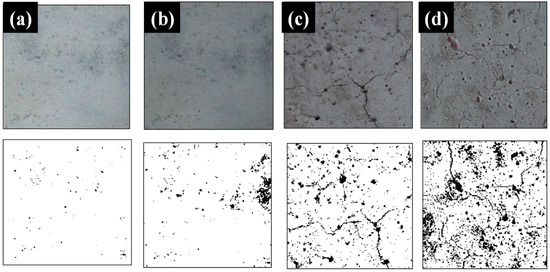The implementation of damage detection through fire-affected concrete images was conducted to effectively determine the extent of the damage. The image analysis implementation was executed in a MATLAB environment. The images were obtained from real-time exposure experiments with constant illumination. These images were collected from different heating durations, such as 30, 60, 90, and 120 min. Two major steps were followed to detect the damage presented in the images. The input images were diagnosed using an anisotropic filter [46]. The diagnosed image was used to find the damage in the concrete images. The technique adopted by [47] was used to highlight the cracks of the fire-affected concrete image. The ripplet transform, a higher-order wavelet transform, was used to effectively engrave the damages. It was widely used to understand images and medical image analysis [48]. Figure 14 shows a few sample images of the inputs and their damage.