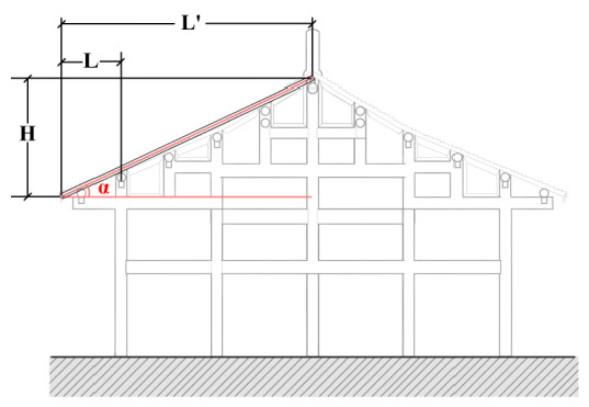 Two types of variables are included in this study. Roof slope and picket length are the two dependent variables that define the form of the roof. Roof slope is represented by the slope angle, which is calculated as = (Figure 2). As the heights of the residential buildings do not vary greatly, the length of the eaves of the buildings L was also counted on this basis.