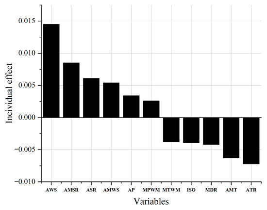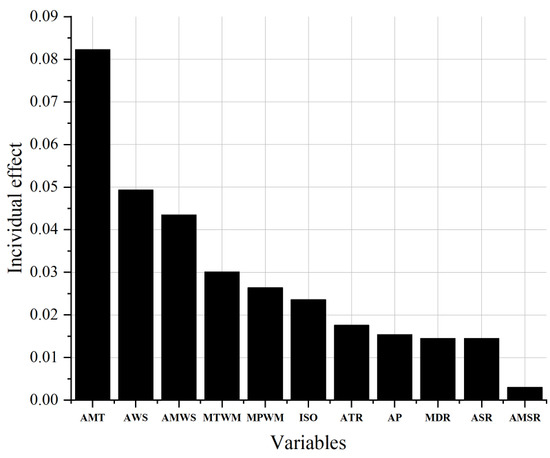AMT had the highest individual importance on roof slope (8.23%), followed by AWS (4.93%), AMWS (4.35%), MTWM (3.01%), and MPWM (2.64%). Alternatively, AWS (1.45%) exerts the greatest influence on eaves length, followed by AMSR (0.85%), ASR (0.61%), AMWS (0.54%), and AP (0.26%).
