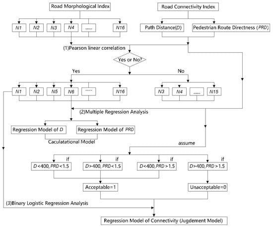 As shown in the framework, the data of the built-environment indicators and road connectivity indicators of the residential area are measured separately (Figure 2, Table 2). Built-environment indicators include the number of entrances and exits N1, the length of the long side of the residential area N2, the length of the short side of the residential area N3, the ratio of the long and short sides N4, the area size of the residential area N5, the total road length N6, road network density N7, the number of nodes N8, the number of links N9, intersection density N10, the number of X-junctions N11, the number of T-junctions N12, the X ratio N13, cell road N14, culs-de-sac N15, and cell ratio N16—16 items in total. Road connectivity indicators include path distance (D) and pedestrian route directness (PRD). An analytical prediction model is built between each of the indicators of the built environment of the residential area (N), the path distance (D), and pedestrian route directness (PRD). The steps to establish an analytical prediction model are as follows: (1) In the SPSS software, Pearson correlation analysis is used to calculate the linear correlation between the road network shape index and the path distance (D) as well as the pedestrian route directness (PRD). (2) Using the SPSS software, multiple linear regression analysis is used to build a comprehensive calculation model for path distance (D) and pedestrian route directness (PRD). (3) Using SPSS software, binary logistic regression analysis is used to establish an application judgement model for whether road connectivity is acceptable and to apply the model for a connectivity measurement test.