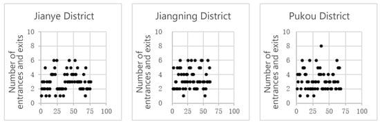 The data show that the distribution of the number of entrances and exits of residential areas in these three districts are close. Jianye and Pukou District mainly have about 2–4, and Jiangning District mainly has about 2–5. In Jianye, 32.89% of the residential areas have two entrances and exits, whereas the number is 26.26% in Jiangning and 34.44% in Pukou. In Jianye, 27.63% of the residential areas have three entrances and exits, whereas it is 31.15% in Jiangning and 26.87% in Pukou. Due to the large size of the residential area in Pukou District, 16.42% of the residential areas have four entrances and exits. The average and median number of entrances and exits in the three districts are close to three, indicating that regardless of the scale of the residential area, two or three entrances and exits account for the largest number (Figure 3 and Table 3).