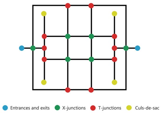 Connectivity refers to the number of directions and paths to a destination, and it is an indicator of measuring how easy it is to travel between locations [16]. High connectivity is the goal of any transportation network. Good road connectivity can reduce travel distance and time, multiply the choice of travel routes, reduce unnecessary bypass distance, and increase accessibility. Road connectivity is meant to “improve accessibility and reduce traffic barriers” [17]. The factors that determine road connectivity often involve efficiency, distance, and the diversity of options, and the attribute of road connectivity depends on the trade-offs among these three factors. For pedestrian traffic, a well-connected road network is equipped with many short links, numerous notes, and fewer culs-de-sac. As the travel distance decreases and the path selectivity increases, destinations are more easily connected directly, all of which contributes to creating a more accessible and flexible transportation system. On the other hand, for cars, a higher traffic speed often requires less connectivity by reducing intersections and restricting pedestrian crossings. Thus, the connectivity of car and pedestrian traffic is sometimes contradictory.