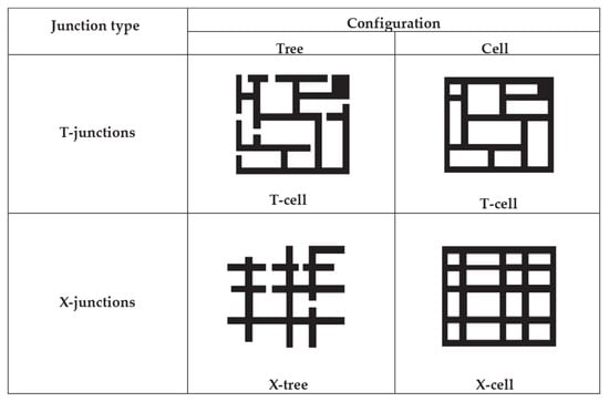 The intersection forms of the road network in residential areas are generally X-junctions and T-junctions. The X-junction usually appears at the intersection of roads of the same level. The T-junction usually appears at the connecting point of the main and secondary road. Road networks dominated by X-junctions usually present a strong grid feature, and road networks dominated by T-junctions often present a tree-like feature. According to the combined plot proposed by Marshall [23], a two-dimensional coordinate space of “T ratio–X ratio” and “cell ratio–cul ratio” can be constructed. This quantitative measurement method helps to describe the degree of how “griddy” or “tree-like” the road network appears, and the intersections and road forms are classified and compared (Figure 6). In the figure, the left, right, upper, and lower coordinate axes respectively represent the T ratio, X ratio, cell ratio, and cul ratio, so the four corner points respectively represent four pure “configuration” forms, where the upper right is a “pure T grid”, the upper left is a “pure T tree”, the lower right is a “pure X grid” and the lower left is a “pure X tree”.