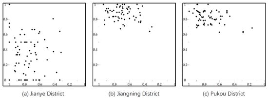 According to the projection position of the four sets of data—the T ratio, X ratio, cell ratio, and cul ratio—of the residential area road network sample in different districts in the coordinate space, the primary road network type of the residential areas in the very district can be judged. Most of the road network type of residential areas in Jianye District are distributed between “pure T tree” and “pure X tree” and are partial to an “X tree” form, which can be regarded as a “variant grid” road network; Jiangning District and Pukou District are distributed above the coordinate area, and most of the residential areas present the characteristics of “T tree”, that is, road network characteristics based on a “tree shape” (Figure 7 and Figure 8).