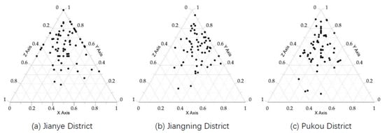 It can be seen from the graph that there are points of the samples in Jianye District distributed in both the middle and oblique sides of the triangle, indicating that the type of the road network in Jianye District is various and with an even amount. There are few points on the oblique side in Jiangning District and Pukou District compared with Jianye district, indicating that there are few extreme samples that have no X-junction or cul-de-sac. The node gram of Jiangning District shows that there are more residential areas of fewer culs-de-sac.