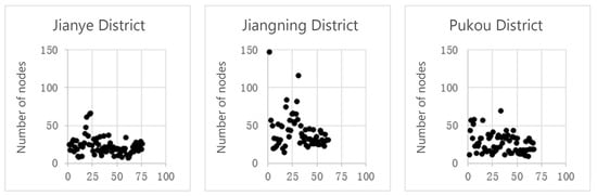The number of nodes in the residential area of Jianye District is mainly concentrated within 17–30, with an average of 25. Jiangning District is mainly concentrated within 28–53 nodes, with an average of 44, the most in the three regions. Pukou District is mainly concentrated within 17–35 nodes, with an average of 27. In contrast, the number of nodes in the residential area of Jiangning District is the highest, indicating that there are more intersections of different streamlines in the settlement, which is caused by the fact that the internal factors of the large-scale settlement are richer (Figure 10 and Table 6). On the other hand, the layout of elements, such as the architectural landscape, is related.