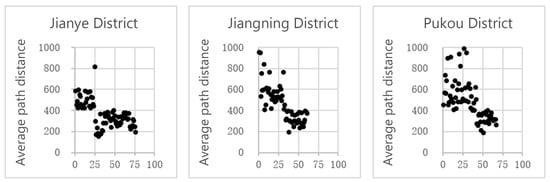 According to the calculation results of the 204 residential areas, the distance between the residential areas of Jianye District and the intersections of the city is mainly distributed in the range of 278–443 m, and the average walking distance is 363 m. This distance is suitable for general walking. However, in Pukou District and Jiangning District, the path distance of the residential area is mainly distributed in the range of 300–600 m, with an average distance of 450 m. The path distance of more than 50% of the residential areas in these two districts is longer than 450 m, which is much higher than the reasonable expectation of daily walking (Figure 11 and Table 7). The residential areas of Pukou and Jiangning District are not suitable for residents to walk.