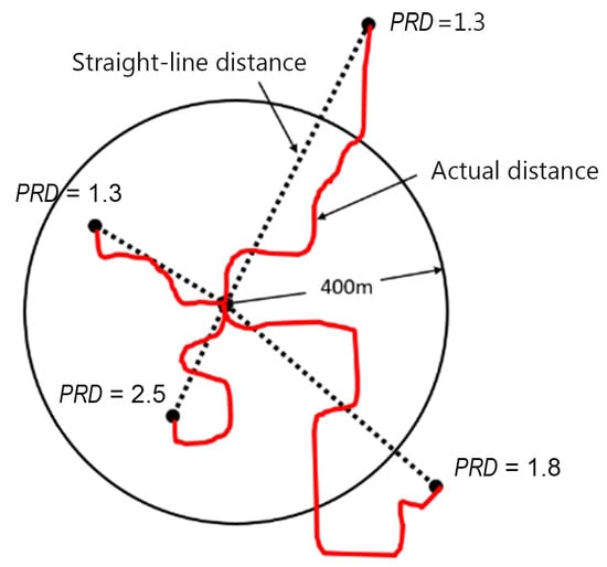 • In the ArcGIS software, the path analysis tool is used to calculate the linear distance and the shortest path distance (D) from the geometric central point to the adjacent city intersection of each residential area sample, and the PRD is calculated.