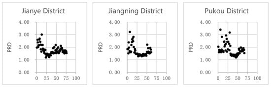 In the ArcGIS software, the path analysis tool is used to calculate the linear distance and the shortest path distance of each residential sample from the geometric central point to the adjacent city intersection, and the PRD coefficient is calculated (Figure 13 and Table 8). From the results of data distribution, the average PRD value of residential areas in Jiangning District is 1.69, and most of the samples are below the average level. The average value of 1.77 in Jianye District is better than the value of 1.84 in Pukou District, but the data are mainly distributed in the range of 1.53–1.95. Compared with the data of 1.41–1.98 in Pukou District, there are fewer samples whose directness is acceptable. In conclusion, the directness level of the road network in residential areas in the three districts is not desirable, as the average values of PRD are all greater than 1.6.