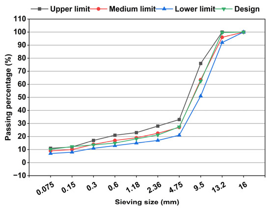 The gradation of the deicing mixture was designed as a stone mastic asphalt (SMA) mixture with a maximum nominal particle size of 13 mm and a passing rate of 27.6% for the 4.75 mm sieve. The gradations of the mixture are illustrated in Figure 3. The lignin fiber with a content of 0.35% was blended in the mixture, and the optimum binder content was determined to be 6.2% by the standard [29]. ZGHIT deicing agent is a filler product, and it was incorporated into the mixture by internal mixing method, in which 0%, 30%, 50%, and 70% by volume of the mineral filler were replaced, respectively. The mixing process was the same as ordinary asphalt mixture, namely, adding aggregates and asphalt first and mixing for 90 s, then adding mineral filler and deicing agent for another mixing of 90 s.