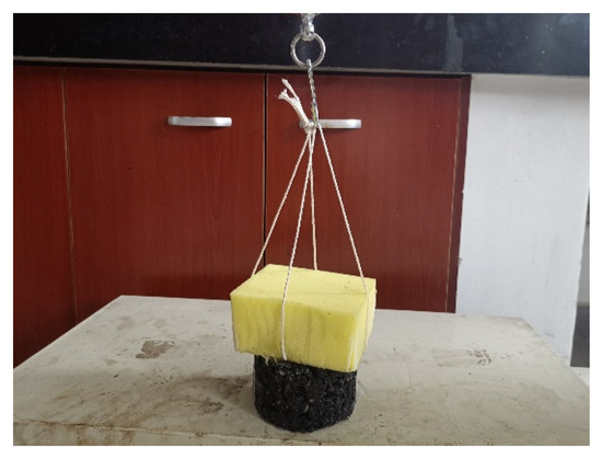 The interface adhesion test was designed regarding the adhesive binder bonding strength test (drawing method) in specification [29] to test the bonding force between the deicing asphalt mixture and the frozen sponge to reflect the de-icing effect of the deicing agent when the pavement is icy. The crossed nylon rope was fixed at the bottom of the sponge (120 mm × 100 mm × 60 mm) and then placed on the Marshall specimen after the sponge was filled with water. The combined specimen was then frozen in the refrigerator at −10 °C for 2 h until the water in the whole sponge was frozen into ice. The pointer-type tensiometer was hooked on one side of the nylon rope to slowly pull the frozen sponge and the Marshall specimen apart. Each group was set to three parallel specimens. The force during the pulling procedure was recorded as the interface adhesion, as shown in Figure 4. For the interface adhesion test, the smaller the pulling force between the icing sponge and the Marshall specimen means the weaker bond between the ice and the mixture.