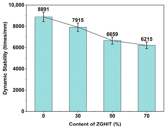 As shown in Figure 6, the wheel tracking test results indicate that as the deicing agent content increases, the high-temperature performance of the asphalt mixture gradually decreases. The proportion of the decrease in DS is related to the amount of deicing agent replacement. The DS values of asphalt mixture with 30%, 50%, and 70% deicing agent replacement decreased by 10.98%, 25.10%, and 30.10%, respectively compared to the mixture with 0% deicing agent, while the DSs of those mixtures are still able to meet the specification requirements in [30]. The decrease in high-temperature performance may be contributed to the fact that the specific surface area of deicing agent filler is smaller than that of mineral filler, which plays a role in absorbing excess asphalt in the asphalt mix. The replacement of mineral filler by the deicing agent will lead to the increment of free asphalt content and the corresponding reduction of structural asphalt content that provides bond strength and mechanical strength [33]. Therefore, the dynamic stability of the asphalt mixture decreases.