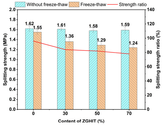 As shown in Figure 8, the histogram indicates the splitting strength of the asphalt mixture without freeze-thaw and after freeze-thaw, and the line indicates the freeze-thaw splitting strength ratio of the corresponding asphalt mixtures. The splitting strength values of the specimens without freeze-thaw were approximately equal, while they show a decreasing trend with the increasing content of the deicing agent after freeze-thaw. The strength ratio of freeze-thaw splitting also shows the same trend. The results are considered as the active ingredients in the deicing agent would cause water intrusion, and the water entering the specimen would freeze and expand at low temperatures, which accelerates the speed of the asphalt detaching from the aggregate surface. In addition, during the freeze-thaw cycle, the precipitated salts may re-crystallize and expand, resulting in potential stress concentration on the void surface, which also aggravates the water damage of the specimen to a certain extent.