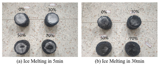 It could be visualized from Figure 9 that there was a significant difference in the ice melting effect of Marshall specimens with different deicing agent replacement amounts, and the deicing agent can improve the ice-melting ability of the asphalt mixture. The ice-melting rate of different specimens with time is shown in Table 4. When the melting time is 50 min, the specimens with 70% of the replacement amount of deicing agent melt all the ice, while the specimens without deicing agent melt only 18.28% of the ice. This suggests that the deicing agent has an obvious effect on melting ice. The ice-melting rates of the four groups of specimens were compared for 30 min, and it was found that the ice-melting rates of the specimens with 0, 30%, 50%, and 70% deicing agent replacement were 12.39%, 34.85%, 47.25%, and 63.34%, respectively, corresponding to the improvement of the ice melting performance of 1.81, 2.81 and 4.09. This means that the addition of a deicing agent can significantly improve the deicing ability of the specimens. However, the increase in the amount of deicing agent is limited to improve the ice-melting ability of the specimens.
