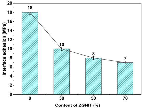 As mentioned above, the interface adhesion test could reflect the deicing effect of the deicing agent. The test results are shown in Figure 10. The bonding force between the asphalt mixture with the deicing agent and the frozen sponge is smaller than that of the conventional asphalt mixture. Moreover, the bonding force decreases gradually with the increase inthe replacement ratio of the deicing agent. Interestingly, the reduction of the bonding force with 30%, 50%, and 70% deicing agents is gradually smaller, with the reduction being 44.4%, 55.5%, and 61.1% compared with the conventional asphalt mixture. The interface adhesion is related to the release of the active ingredient of the deicing agent. The active ingredients are released to the pavement surface to reduce the freezing point and promote the melting of the ice layer. The smaller the bonding force means the weaker bond between the ice layer and pavement, which signifies the better melting effect of the deicing asphalt mixture. Similarly, the icing resistance is more evident after incorporating the deicing agent into the mixture, while it cannot be further improved if merely increasing the content of the deicing agent. This observation of the interface adhesion reduction agreed with the findings of the previous studies [19].