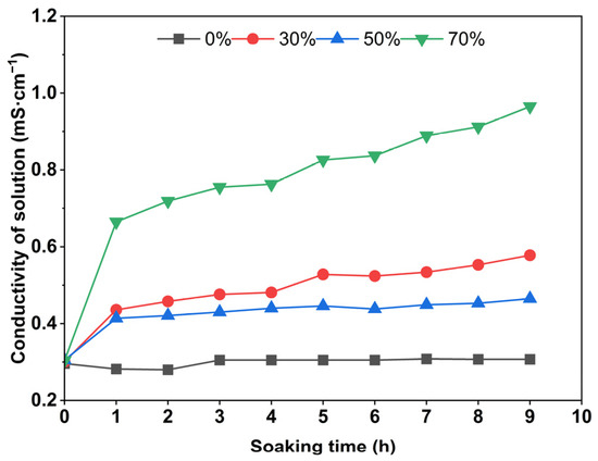 Figure 11 demonstrates that the conductivity of the soaking solution after adding the deicing agent increases with the soaking time, especially within 2 h of soaking. The conductivity values of the soaking solution of different replacement mixtures are almost stable after 2 h. As a comparison, the conductivity of the solution of the conventional asphalt mixture maintains stability during the whole procedure. The conductivity curve of the soaking solution with 50% replacement of anti-icing agent asphalt mixture was between the conductivity curves of the soaking solution with 30% and 70% replacement of anti-icing agent asphalt mixture. Furthermore, the conductivity value of the soaking solution of asphalt mixture with 70% deicing agent replacement is about twice that of other deicing agent replacements of asphalt mixture. Undoubtedly, the conductivity of the soaked solution increases with the increasing content of the deicing agent.