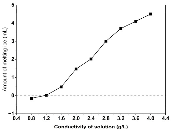The melting ability of the deicing agent is closely related to the concentration of the active ingredient. When the concentration of the active ingredient is lower than the critical concentration, the melting ability would be lost. According to the method of durability prediction of the deicing agent in [8], the ice-melting ability test of the solution with gradient concentration was designed to determine the critical concentration and the corresponding critical conductivity of the deicing agent. Nine groups of ice samples with thesame volume were prepared by filling a plastic cup with 50 mL of pure water and freezing them in a refrigerator. Correspondingly, nine solutions of different concentrations ranging from 0.8 to 4 g/L were prepared according to the concentration gradient of 0.4 g/L. After that the conductivity of each group was measured. Before starting the test, the solutions were placed in a 0 °C environment to reduce the impact of temperature on the test results, as shown in Figure 5. The solutions were subsequently poured onto the ice samples, and the volume of melted liquid was measured after 30 min. The melting volume of the ice sample was used to express the ice melting ability of the gradient concentration solutions.
