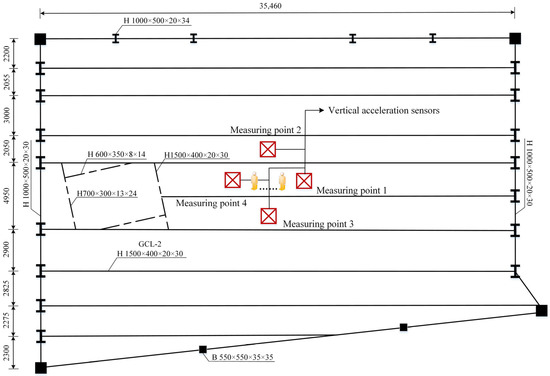 According to the American Road Traffic Capacity Manual HCM2000 [47], the densely populated state of 1 pedestrian/m2 corresponds to 4 people walking synchronously, which is equivalent to 20 people moving freely [48]. For the case of queue congestion, the crowd density is determined as 2 pedestrians/m2, and the maximum number of pedestrians is 40, equivalent to 200 people moving freely. As illustrated in Figure 6b, the pedestrian-induced load is applied in the scope of 10 m × 10 m as a vibration-sensitive location.